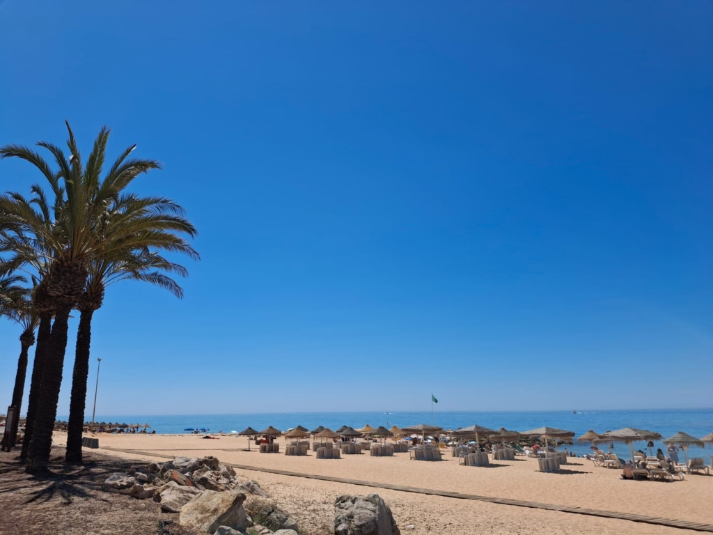 Zona nova de Quarteira com piscina, acesso direto à praia e varanda aberta com vista mar .